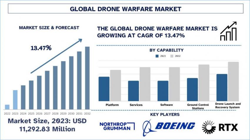 According to the UnivDatos, The Drone Warfare Market was valued at USD 11,292.83 million in 2023 and is expected to grow at a robust CAGR of around 13.47% during the forecast period (2024-2032). The global drone warfare market has advanced with improved global demand in modern warfare for state-of-the-art unmanned aerial systems (UAS). Countries around the globe are procuring technical advances in order to improve their fighting strength, increase vigilance and optimize the operations’ efficiency.