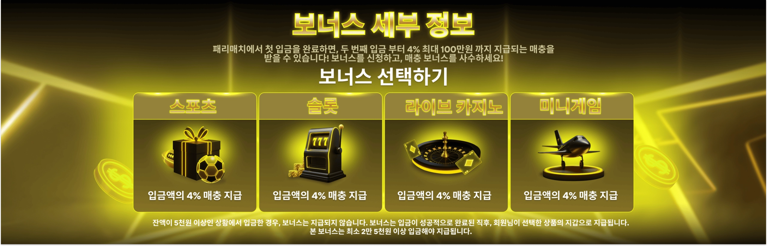 코리아 이용자를 위한 보너스 프로그램은 회원가입을 완료하고 조건을 충족한 모든 유저를 대상으로 합니다. 참가자들은 환영 보너스, 입금 퍼센트 보너스, 프리스핀, 생일 맞춤형 선물, 프로모코드뿐만 아니라 스포츠 베팅을 즐기는 이용자들을 위한 특별한 혜택도 받을 수 있습니다. 특히 패리매치 배팅사이트에서는 프리베팅, 추가 예치금, 독점 프로모션 등 다양한 보너스가 제공되어 신규·기존 회원 모두 혜택을 누릴 수 있습니다.