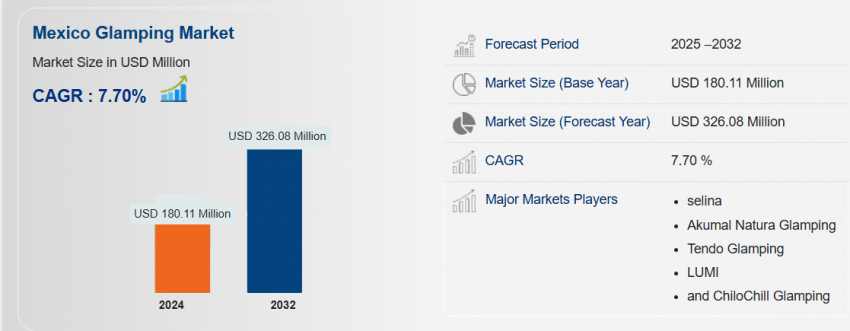The Mexico glamping market size was valued at USD 180.11 million in 2024 and is expected to reach USD 326.08 million by 2032, at a CAGR of 7.7% during the forecast period