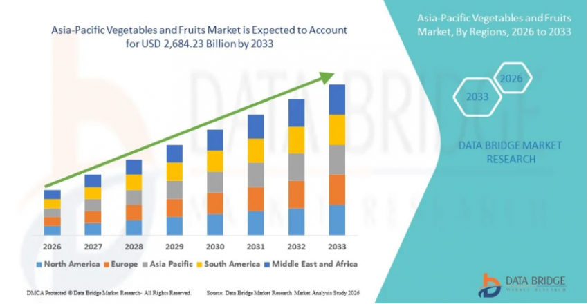 The Asia-Pacific vegetables and fruits market size was valued at USD 1,061.16 billion in 2025 and is expected to reach USD 2,684.23 billion by 2033, at a CAGR of 12.30% during the forecast period